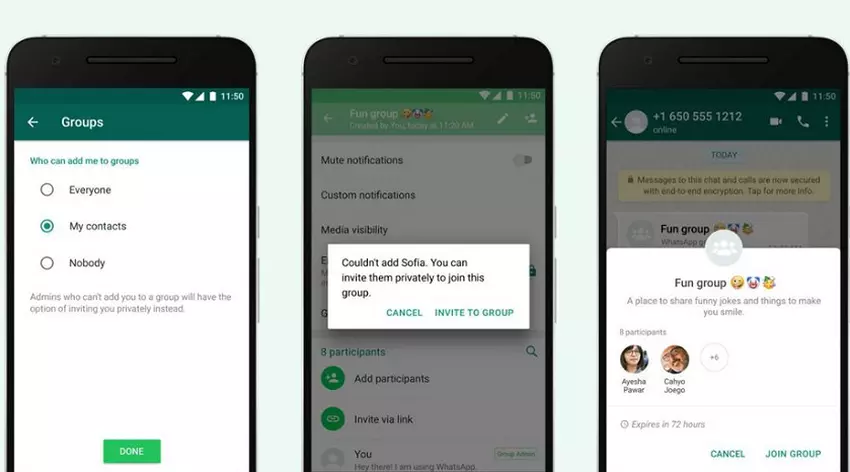 Twórcy ogłosiły nową sekcję, która pozwala określić, kto będzie mógł zaprosić członków komunikatora do grupy. Aby to zrobić, wystarczy, aby przejść do ustawień prywatności i postawić znak wyboru obok jednej z trzech opcji: „All”, „Moje kontakty” i „Nobody”. Nie jest to bardzo duży wybór, ale pomoże w jakiś sposób chronić użytkowników przed niechcianymi powiadomieniami