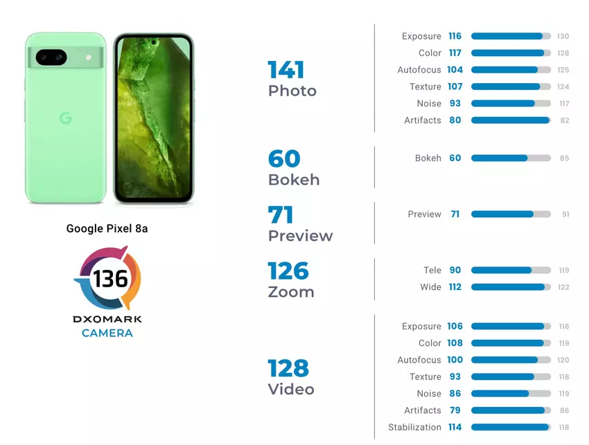 W teście DXOMARK aparat smartfona Google Pixel 8a uzyskał 136 punktów: to 2. miejsce w segmencie cenowym (400-600 USD)