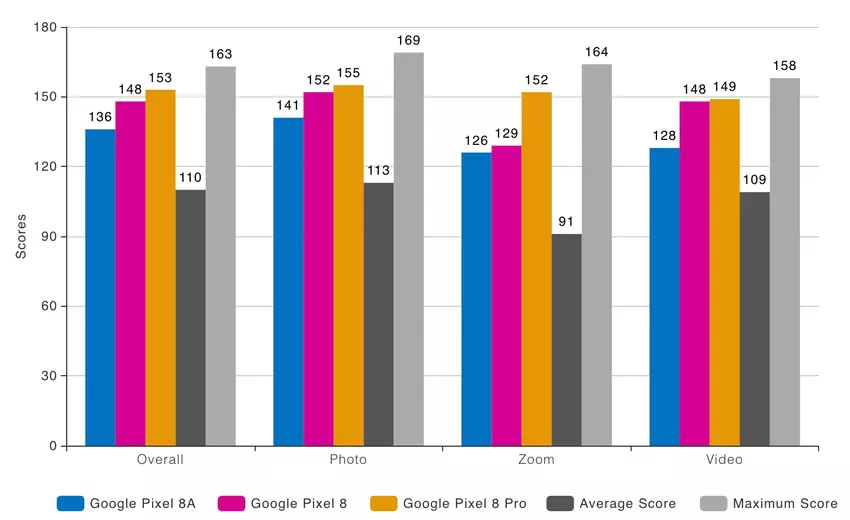 Google Pixel 8a wykazał się wysokimi wynikami jak na standardy swojej klasy w testach DXOMARK Camera, nawet w porównaniu do swojego poprzednika, Pixela 7a. Zastosowanie chipsetu Google Tensor G3, podobnie jak w Pixelu 8, nie pozwoliło Pixelowi 8a całkowicie pozostać w tyle za swoim flagowym rodzeństwem. Chociaż wyniki zdjęć i zoomu były podobne do Pixela 8, jakość wideo nie osiągnęła tego samego poziomu. Odwzorowanie kolorów i odcieni skóry na zdjęciach było jednak imponujące. Chociaż teleobiektyw nie osiągnął najlepszych standardów, a nagrywanie wideo miało swoje wady, badacze Google Pixel 8a stwierdzili, że smartfon ten pozostaje atrakcyjnym wyborem dla tych, którzy cenią sobie wysoką jakość w segmencie smartfonów od 400 do 600 USD.