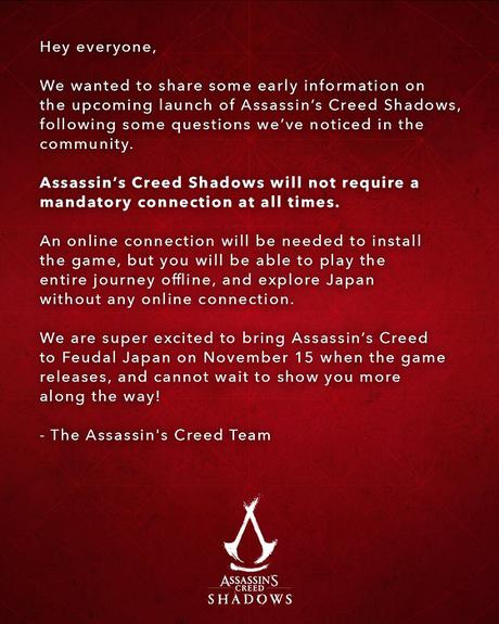 Dziś wiele mediów, w tym nasz portal, podzieliło się informacją, że Assassin's Creed Shadows wymaga stałego połączenia z internetem do rozgrywki, mimo że jest to gra dla jednego gracza.