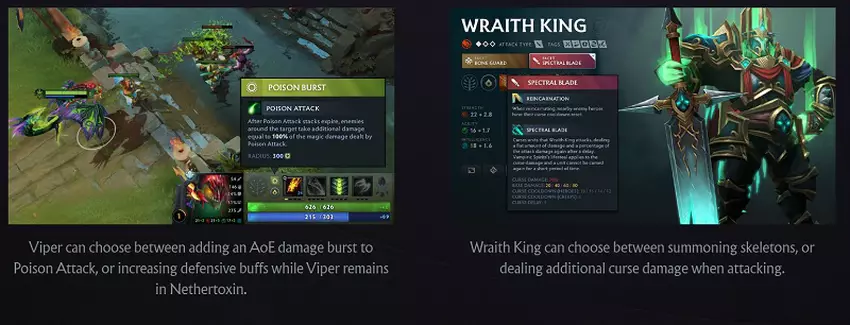 • Aspekty wpływają na bohaterów na wiele różnych sposobów. Przykładowo, Viper może dodać natychmiastowe obrażenia wokół ofiary ataku trucizną lub stać się bardziej wytrzymały w obszarze działania Nethertoksyny, podczas gdy Wraith King może przywoływać szkielety lub zadawać dodatkowe obrażenia Jinx swoimi atakami.