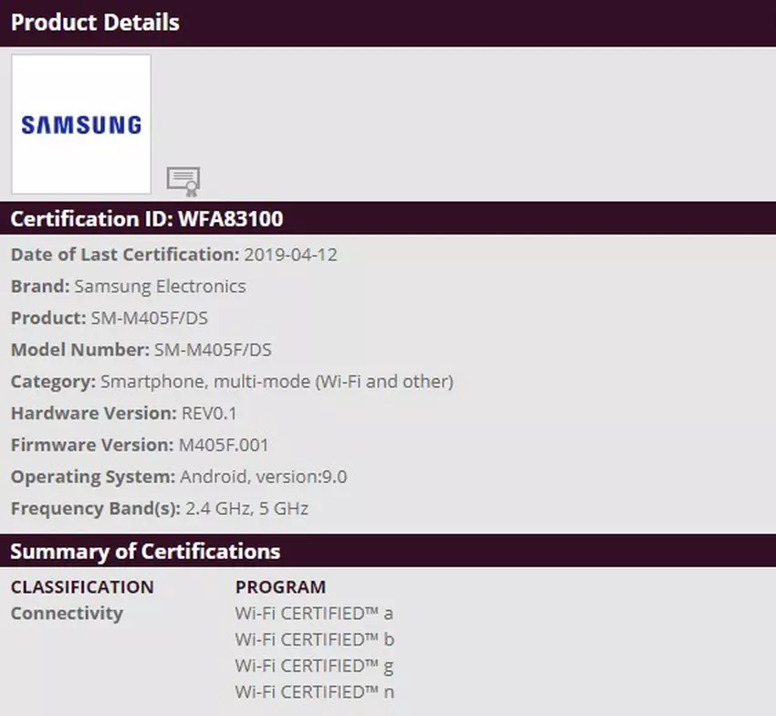 Na stronie bazy danych Wi-Fi Alliance zauważono nowe urządzeńie producenta z numerem modelu SM-M405F / DS. Jest to kolejny budżetowy smartfon M-Series - Galaxy M40. Niestety, szczegółowe specyfikacje urządzenia certyfikacja nie ujawniła, ale część informacji jednak udstęmpniła. Na przykład smartfon z systemem Android OS 9 Pie i posiada wsparcie dla Dual SIM, a także Wi-Fi 2,0 GHz i 5,0 GHz. Raczej, jak jego młodszy brat, Galaxy M40 wyposażą AMOLED-wyświetlaczem i kamerą główną z kilku modułami.