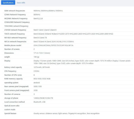 Możliwości fotograficzne są reprezentowane przez podwójny aparat na zewnętrznym wyświetlaczu z głównym czujnikiem 50 MP i dodatkowym czujnikiem 13 MP oraz przednim aparatem 32 MP na wewnętrznym wyświetlaczu. Dwuogniwowa bateria o łącznej pojemności 3949 mAh, która prawdopodobnie będzie sprzedawana jako 4000 mAh, obsługuje szybkie ładowanie 33W.