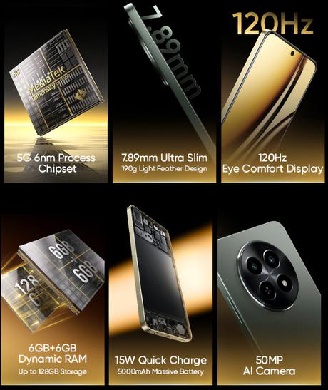 Gadżet jest wyposażony w system Android 14 i autorski interfejs Realme UI 5.0. Nowość ma zamontowany z boku czujnik odcisków palców, gniazdo 3,5 mm, baterię 5000 mAh z ładowaniem 15 W i stopień ochrony IP54. Smartfon waży 190 gramów.