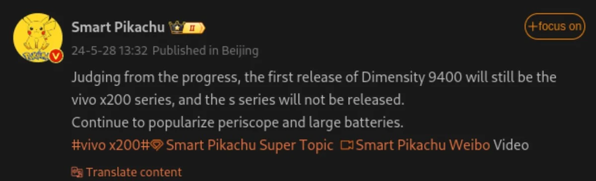Insider Smart Pikachu poinformował, że seria smartfonów Vivo X200 będzie pierwszą, która wyjdzie z chipsetem MediaTek Dimensity 9400. Vivo jako pierwsze zastosowało już Dimensity 9300 w modelach X100 i X100 Pro, a także nowy układ Dimensity 9300 Plus w smartfonach X100s i X100s Pro.