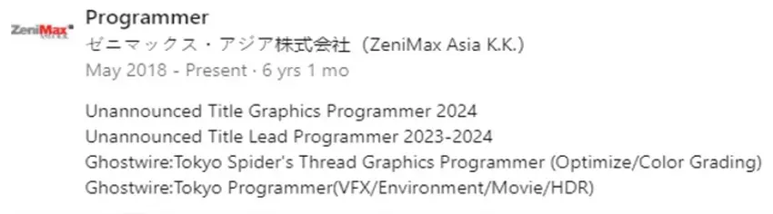 W swoim profilu na Linkedin były pracownik Tango Gameworks, Tsuyoshi Okugawa, wskazał, że był głównym programistą w niezapowiedzianej grze z lat 2023-2024 i że pracował nad innym tajnym projektem jako programista graficzny.
