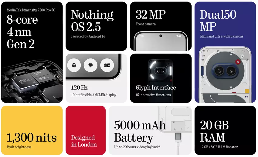 Jeśli mówimy o specyfikacji Phone (2a) Special Edition, to nie uległa ona zmianie. Gadżet nadal ma wyświetlacz AMOLED 120 Hz, ochronę przed wodą IP54, skaner linii papilarnych pod ekranem, procesor MediaTek Dimensity 7200 Pro, aparat główny 50 MP + 50 MP, baterię 5000 mAh z ładowaniem 45 W i podświetleniem Glyph.
