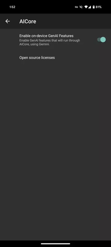 Po aktualizacji ustawienia AICore będą dostępne w Opcjach dla programistów, w sekcji Ustawienia. Ta strona umożliwia włączenie funkcji GenAl, które będą działać za pośrednictwem AlCore przy użyciu Gemini.