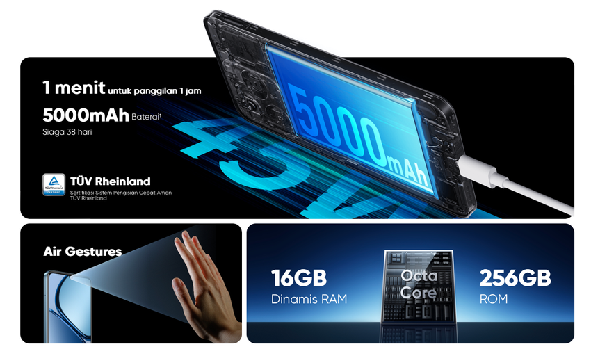 Model został nazwany realme C63. Gadżet otrzymał 6,74-calowy wyświetlacz o rozdzielczości HD+, matrycy LCD, częstotliwości odświeżania 90 Hz i szczytowej jasności 560 nitów. W górnej części panelu umieszczono wycięcie w kształcie litery U z przednią kamerą 8 MP. Główny aparat otrzymał prostokątną jednostkę w stylu iPhone'a i dwa czujniki 50 MP + 2 MP.