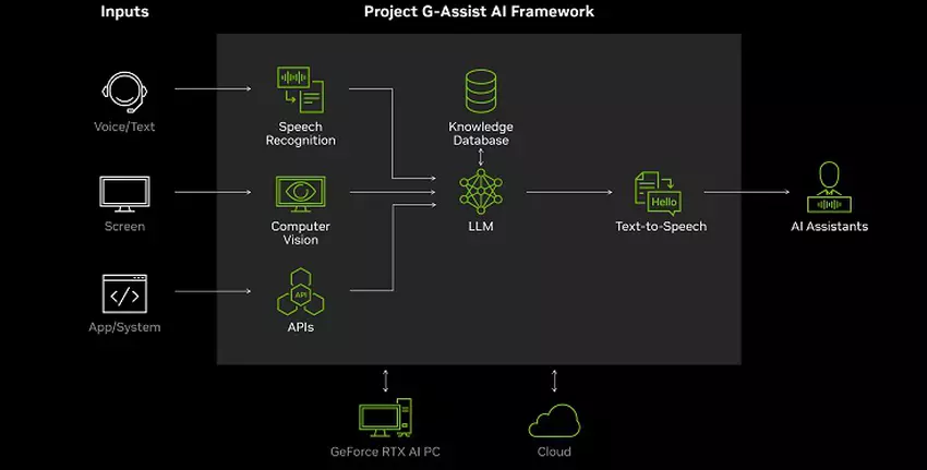 NVIDIA Project G-Assist działa na zasadzie znanych sieci neuronowych i modeli językowych: przyjmuje zapytania głosowe lub tekstowe dotyczące dowolnego elementu gry i udziela kontekstowych podpowiedzi i wskazówek, a asystent jest w stanie nie tylko powiedzieć, na przykład, którą broń wybrać lub które zadanie wykonać jako pierwsze, ale nawet wyjaśnić fabułę, historię i historię świata niemal każdej gry. Project G-Assist może dostarczyć ci zrzut ekranu, a on wyjaśni, co pokazuje lub co należy zrobić dalej.