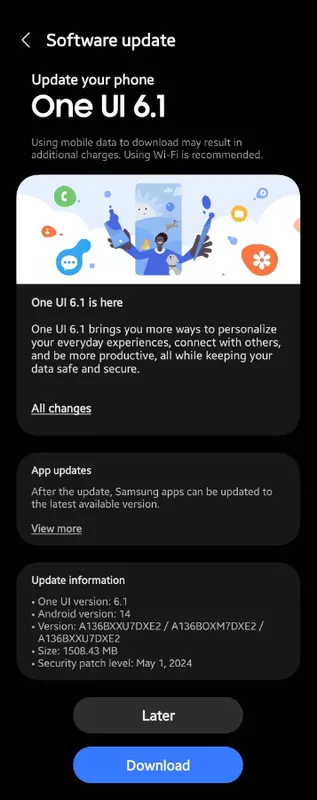 Nowa wersja oprogramowania zawiera majową poprawkę zabezpieczeń Google, a także różne innowacje One UI 6.1. Na przykład nieco zaktualizowany interfejs użytkownika, ulepszone markowe aplikacje, kilka nowych funkcji itp. W przeciwieństwie do flagowych urządzeń, Galaxy A13 5G nie otrzyma Galaxy AI.