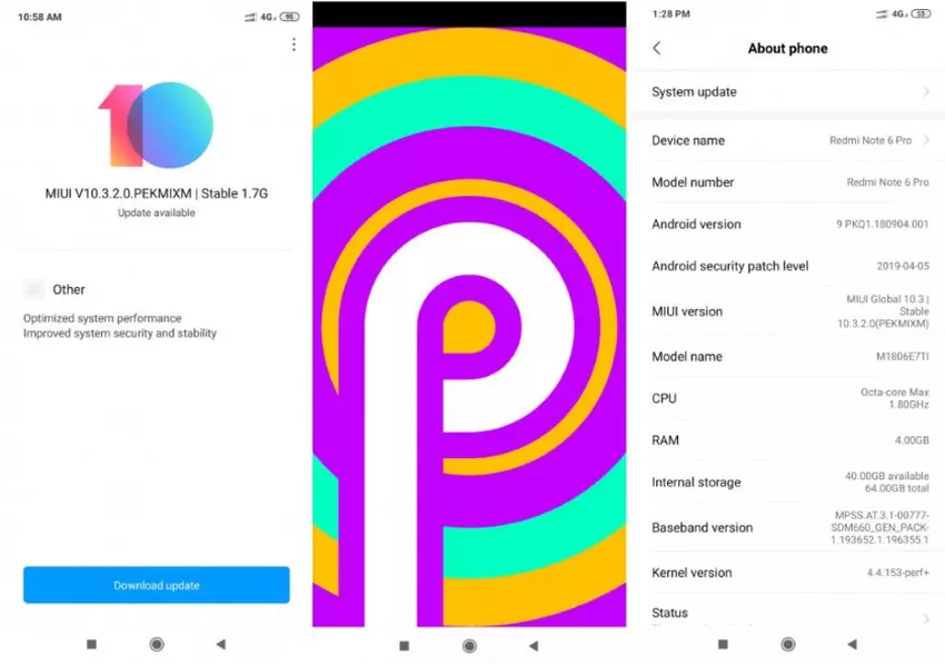 Aktualizacja wyszła z numerem kompilacji MIUI 10.3.2.0.PEKMIXM i kwietniową łatką bezpieczeństwa. Waży około 1,7 GB. Oprogramowanie układowe usunęło pewne niedociągnięcia, a także poprawiło wydajność i żywotność baterii urządzenia. Nowe oprogramowanie nie wprowadza większych zmian, ponieważ Powłoka MIUI 10 zawiera już wszystkie główne cechy „ciasta”.