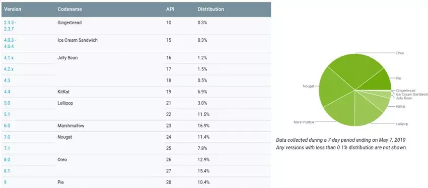 Wszystkie pozostałe wersje systemu operacyjnego wykazują szybki spadek, co jest zasadniczo logiczne: Android Nougat 19,2% (28,2%), Android Marshmallow 16,9% (21,3%) Android Lollipop 14,5% (17,9%) i Android KitKat 6,9% (7,6%) %).