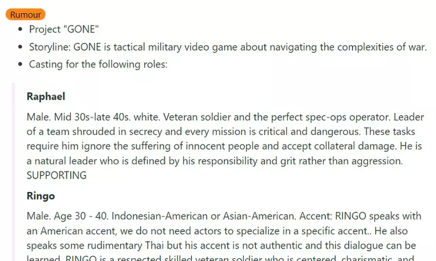 W sieci pojawiła się informacja, że Ubisoft ogłosił casting do ról w pewnej grze pod roboczym tytułem Project Gone. Opis mówi, że jest to taktyczna gra o okropnościach współczesnej wojny, której wydarzenia rozgrywają się w południowo-wschodniej Azji, co jest całkowicie skorelowane z informacjami Hendersona.