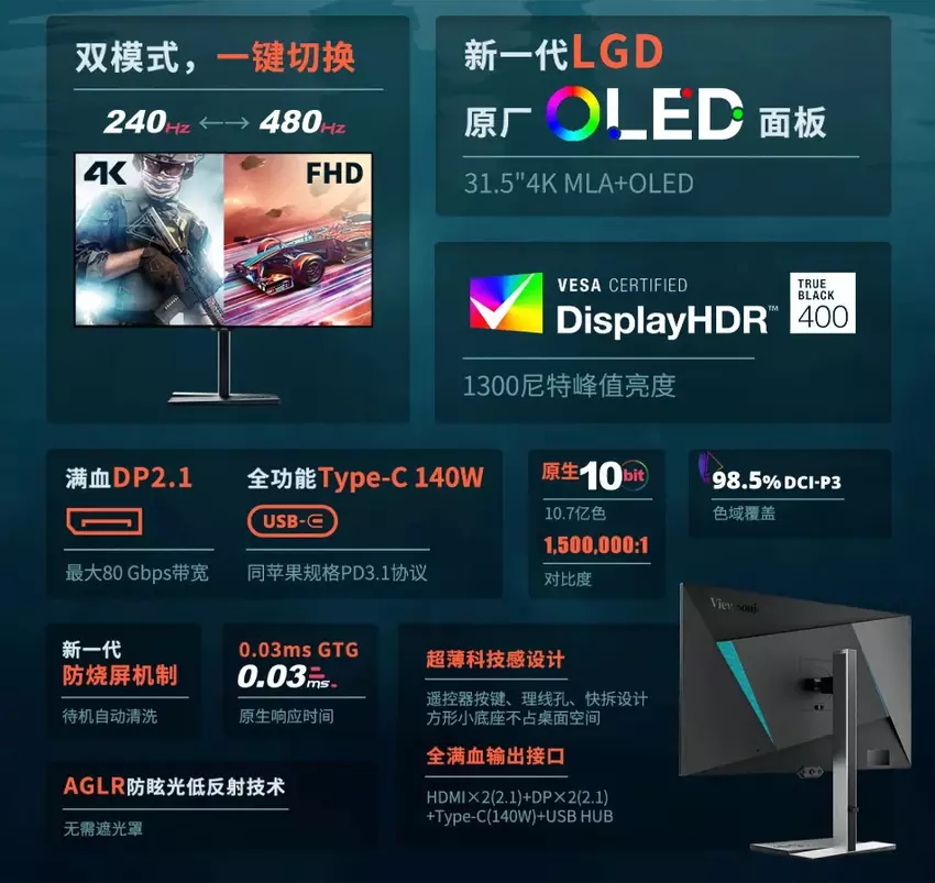 Model został nazwany ViewSonic XG323-4K-OLED2. Urządzenie wyposażono w 32-calowy ekran OLED o rozdzielczości FHD/4K i częstotliwości odświeżania 240/480 Hz. Nowość ma czas reakcji 0,03 ms i certyfikat VESA DisplayHDR True Black 400.