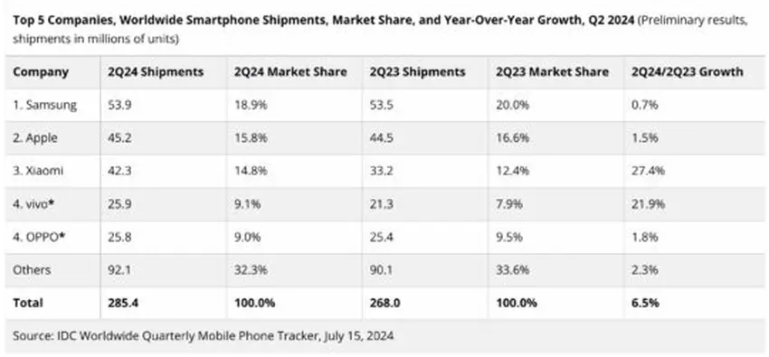 Xiaomi stało się w tym okresie trzecią największą marką smartfonów na świecie. Chińska firma dostarczyła 42,3 miliona smartfonów i zdobyła 14,8% rynku. Jest to znaczący wzrost o 27,4% w porównaniu do ubiegłego roku.
