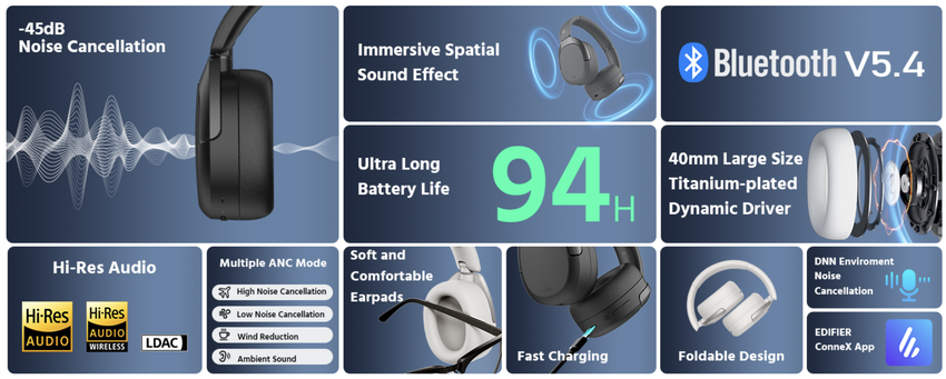 Model waży 267 gramów i posiada miękkie poduszki nauszne, a także regulowany pałąk. Słuchawki wyposażono w 40-milimetrowe przetworniki, a także wsparcie dla kodeka LDAC i hybrydowego ANC. Nowość posiada tryb gamingowy z niskim opóźnieniem dźwięku, a także tryb dźwięku przestrzennego. Urządzenie wyposażono w Bluetooth 5.4 i port ładowania USB-C. Na jednym ładowaniu słuchawki Edifier W830NB będą działać do 94 godzin.