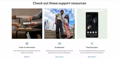 • Telefon Pixel: Linki do typowych problemów i artykułów pomocy technicznej Google, a także zasobów, takich jak informacje o wymianie, przewodniki, symulator Pixel, finansowanie urządzeń, narzędzie do sprawdzania zgodności Nest, preferowana opieka, pomoc w konfiguracji Pixel, informacje o urządzeniach YouTube i osobiste spotkania.