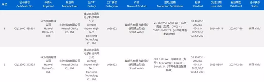 Mowa o modelu Huawei Watch GT 5. Nowość przeszła już różne certyfikaty. Według dokumentów gadżet ma numery modeli VLI-B19 i VLI-B29. Pierwsza wersja otrzyma obudowę 41 mm, a druga - 46 mm. Smartwatch powinien być wyposażony w ochronę przed wodą IP68.