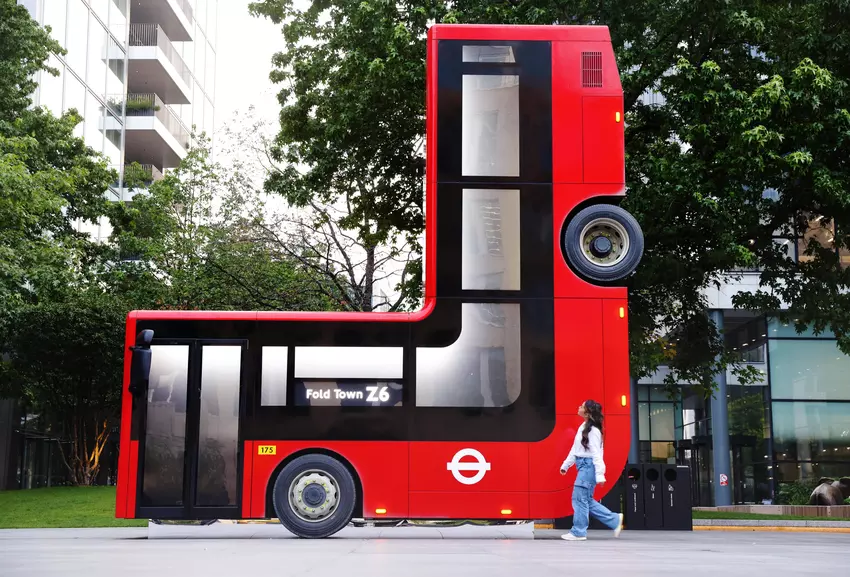 To nie jest prawdziwy autobus, który został przecięty na pół, ani nie jest wynikiem Sketch to Image (o którym możesz dowiedzieć się więcej w naszej recenzji Fold 6). Jest to złożony kształt autobusu stworzony przez artystę Caspara Phillipsa przy użyciu materiałów pochodzących z recyklingu prawdziwych londyńskich autobusów.