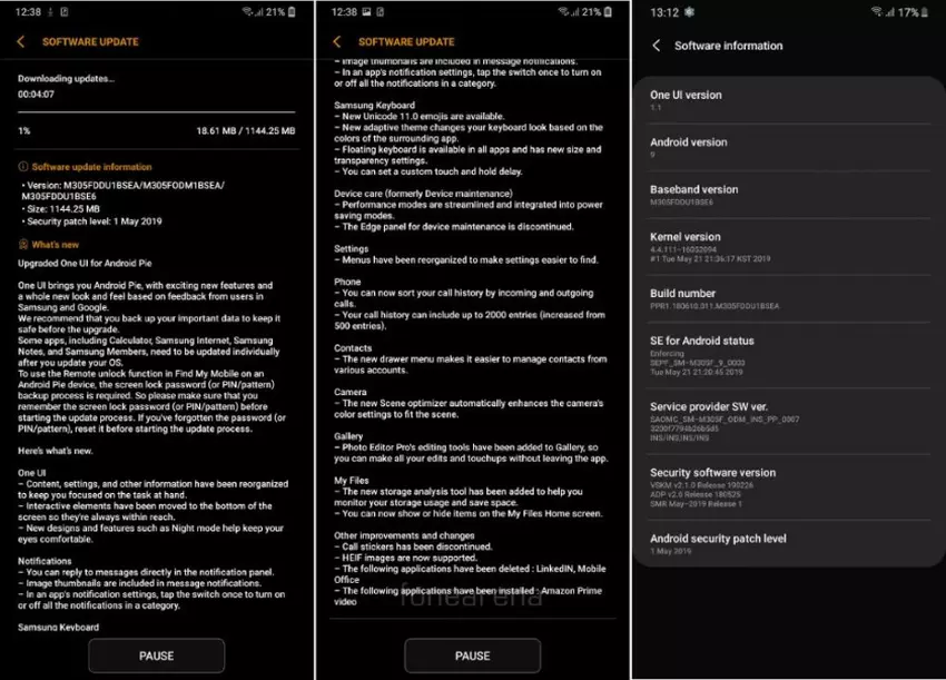 Oprogramowanie układowe otrzymało numer kompilacji M305FDDU1BSEA. Waży 1,1 GB i zawiera wiele przydatnych zmian. Na przykład podstawowe funkcje „tortu”, zastrzeżonej powłoki One UI, która jest zoptymalizowana do obsługi jedną ręką, zmodyfikowany interfejs, nową klawiaturę, zaktualizowane aplikacje „Galeria”, „Kontakty”, „Pliki” i „Kamera”. Ponadto nowe oprogramowanie zoptymalizowało pracę powiadomień, poprawiło wydajność i autonomię urządzenia.