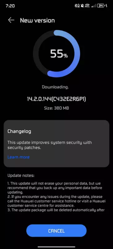 Zgodnie z oficjalną listą zmian, firmware zawiera lipcową poprawkę bezpieczeństwa. Naprawia ona 6 luk systemowych i 28 luk innych firm. Huawei zaleca zainstalowanie aktualizacji, gdy tylko będzie dostępna w ustawieniach urządzenia.