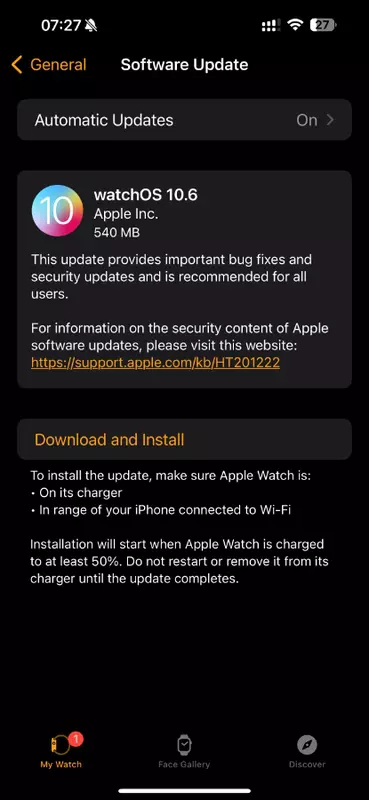Mówimy o watchOS 10.6 dla użytkowników Apple Watch. Firmware jest już wdrażany falami do wszystkich wspieranych modeli smartwatchy. System waży około 600 MB. Obecność OTA można sprawdzić w aplikacji Watch na iPhonie.