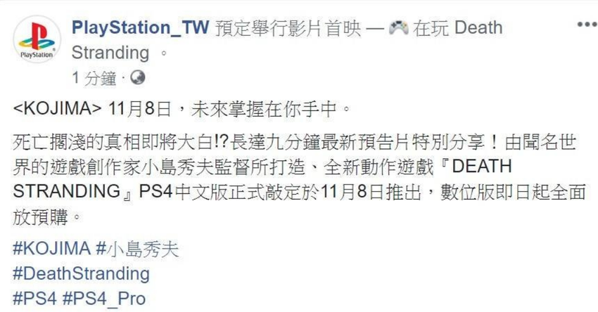 Gracze nadal by myśleli o słowach dziennikarza, ale jednostka PlayStation na Tajwaniu potwierdziła zgadywanie, ogłaszając, że Death Stranding zostanie wydany 8 listopada. Niemniej jednak gracze powinni poczekać na oficjalne ogłoszenie, które może się odbyć 29 maja.