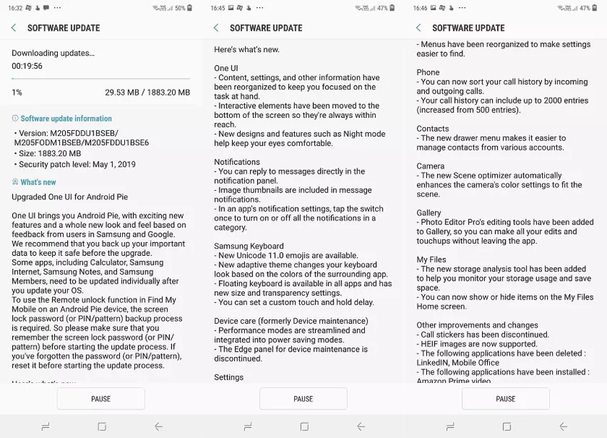 Oprogramowanie dla Galaxy M10 waży 926 MB, a dla Galaxy M20 - 1883 MB. Programiści dodali poprawkę zabezpieczeń May, zastrzeżoną powłokę One UI i wszystkie główne funkcje systemu operacyjnego Android Pie. Ponadto oprogramowanie układowe poprawiło interfejs, kamerę, wydajność i autonomiczny czas działania urządzeń.