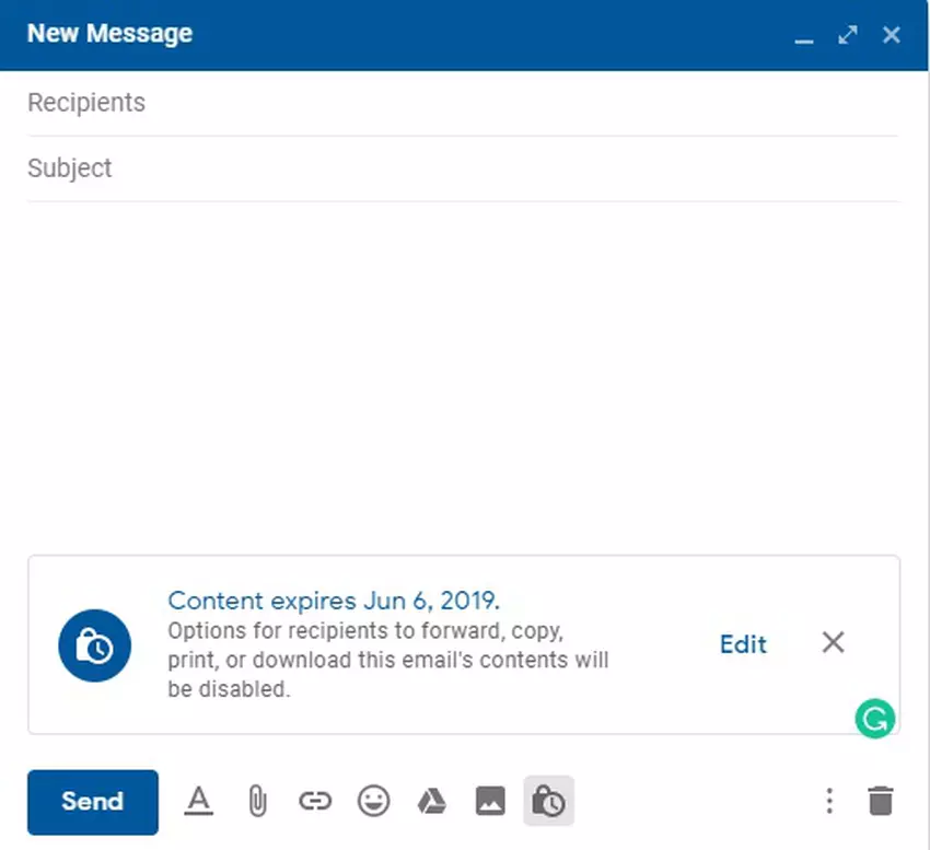 Aby użyć tego trybu, kliknij ikonę zablokowanego zegara znajdującą się po prawej stronie przycisku „Wyślij”. Jeśli okno komunikatu ma niebieski nagłówek i ostrzeżenie bezpieczeństwa na dole, funkcja jest używana.