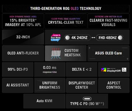 ASUS ROG Swift OLED PG32UCDP jest wyposażony w wyświetlacz OLED 4K. Panel ma przekątną 31,5 cala, czas reakcji 0,03 ms, powłokę antyrefleksyjną i częstotliwość odświeżania do 480 Hz. Ekran obsługuje szczytową jasność 1300 nitów i HDR. Nowość posiada technologie G-SYNC i FreeSync Premium Pro, a także porty USB-C z funkcją Power Delivery do 90W, USB-A, HDMI i DisplayPort.