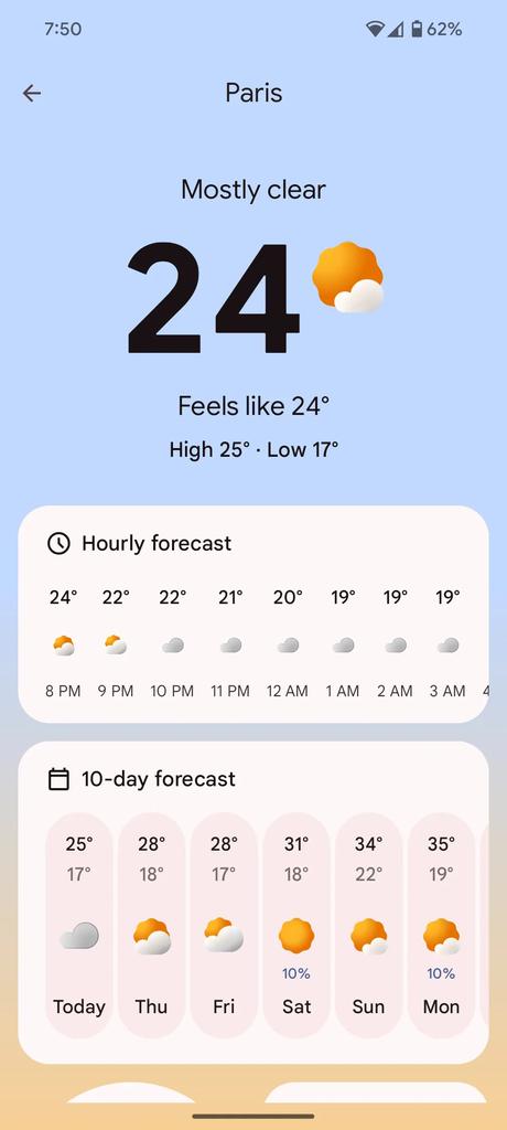 Aplikacja ma minimalistyczny wygląd i wyświetla aktualne warunki pogodowe, prognozę godzinową i 10-dniową. Posiada również interaktywne kafelki ze szczegółowymi informacjami o pogodzie, w tym prędkością wiatru, czasem wschodu i zachodu słońca, indeksem UV i innymi danymi.