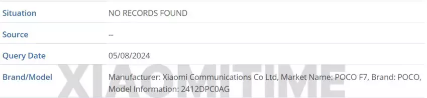 Według najnowszego przecieku, smartfon POCO F7 został niedawno zauważony w bazie danych GSMA. Według doniesień, POCO F7 może być rebrandingiem Redmi Turbo 4, który nie został jeszcze zaprezentowany. Baza danych GSMA wymienia dwa modele POCO F7 o numerach "2412DPC0AG" i "2412DPC0AI", gdzie pierwszy jest przeznaczony na rynek globalny, a drugi na rynek indyjski.