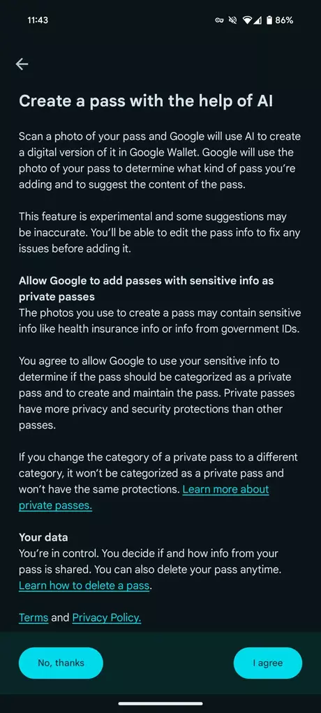 Po wybraniu opcji "Wszystko inne" aplikacja prosi o pozwolenie na przetwarzanie poufnych informacji i organizuje je w kategorie, takie jak przepustka prywatna, przepustka medyczna lub prawo jazdy. Użytkownicy mogą robić zdjęcia identyfikatorów, dostosowywać szczegóły i zatwierdzać produkt końcowy. Chociaż funkcja jest na razie dostępna tylko w Stanach Zjednoczonych, Google planuje wkrótce rozszerzyć ją na więcej urządzeń.