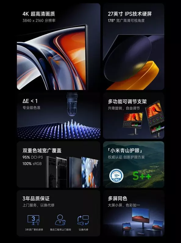 Nowość otrzymała nazwę Redmi Monitor A27U. Model otrzymał 27-calowy ekran IPS o rozdzielczości obrazu 3840×2160p, kącie widzenia 178 stopni, częstotliwości odświeżania 60 Hz i czasie reakcji 6 ms. Monitor charakteryzuje się profesjonalnym poziomem dokładności odwzorowania kolorów z oceną ΔE<1, pokrywając 95% przestrzeni barw DCI-P3 i 100% przestrzeni barw sRGB.