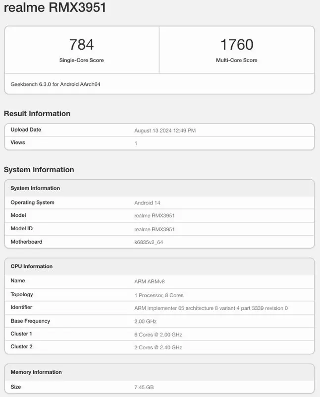 Gadżet przechodzi z numerem modelu RMX3951. Według raportu smartfon będzie działał na ośmiordzeniowym procesorze MediaTek Dimensity 6300. Ponadto nowość otrzyma 8 GB pamięci RAM i system operacyjny Android 14 po wyjęciu z pudełka.
