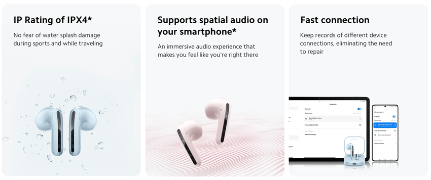 Nowość posiada system dwóch mikrofonów, tryb audio o niskim opóźnieniu, funkcję Google Fast Pair i technologię redukcji szumów dla obcych dźwięków podczas połączeń. Redmi Buds 6 Active wytrzymają na jednym ładowaniu do 30 godzin (z etui). Nowość jest ładowana przez port USB-C.