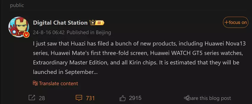 Poinformował o tym chiński insider Digital Chat Station. Na imprezie powinna zostać zaprezentowana seria smartwatchów Huawei Watch GT 5. Ponadto Huawei pokaże smartfony Nova 13, Nova 13 Pro, Nova 13 Pro + i nowy głośnik bezprzewodowy.