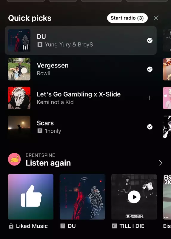 Aby to zrobić, wystarczy kliknąć ikonę plusa, zastępując poprzednią ikonę trzema kropkami. Po wybraniu utworów w prawym górnym rogu ekranu pojawi się opcja "Start Radio".
