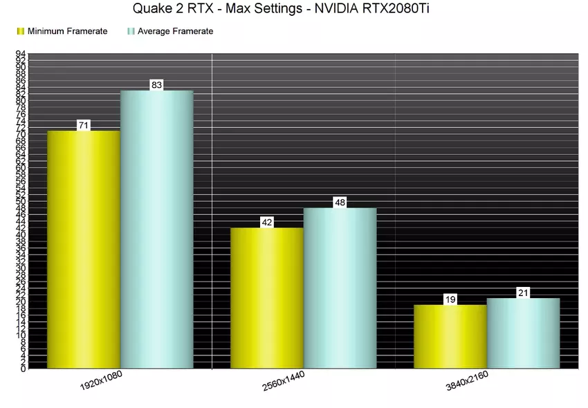 Użytkownicy DSOG postanowili przetestować zaktualizowanego Quake II pod kątem wydajności. Do testów użyto systemu z 16 GB pamięci RAM, procesorem Intel Core i7-4930K i kartą graficzną Nvidia RTX 2080 Ti. Na poniższym wykresie widać, że podczas odtwarzania w 4K średnia liczba klatek wynosiła 21 klatek. W rozdzielczości QHD sytuacja jest nieco lepsza - 48 klatek na sekundę, co wciąż nie wystarcza do wygodnego korzystania z trybu wieloosobowego Kvaki.
