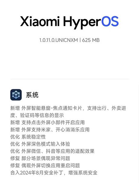 Oprogramowanie układowe zostało wydane z numerem kompilacji HyperOS 1.0.11.0 UNICNXM i waży 625 MB. System zaczął już być dystrybuowany do urządzeń falami. Obecność OTA można sprawdzić w ustawieniach gadżetu.