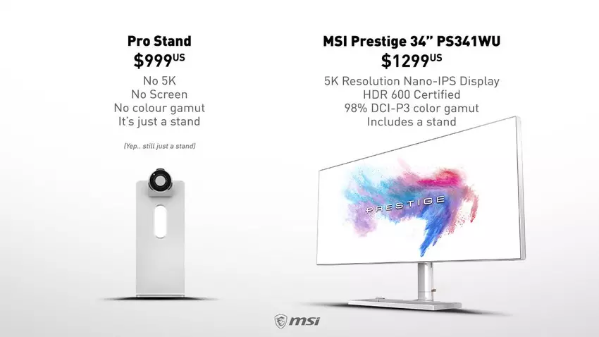 Australijski oddział MSI opublikował na Twitterze reklamę swojego monitora Prestige PS341WU, porównując go ze stojakiem ProStand. Pierwszym z nich jest 34-calowy pełnoprawny monitor z ekranem 5K Nano-IPS i pokryciem 98% przestrzeni kolorów DCI-P3 za 1299 USD, a nawet z bezpłatnym stojakiem. ProStand - to tylko stojak za 1000 USD. Oczywiście wie, jak ustawić monitor w pozycji pionowej i poziomej, ale cel reklamy jest jasny: po co płacić więcej?