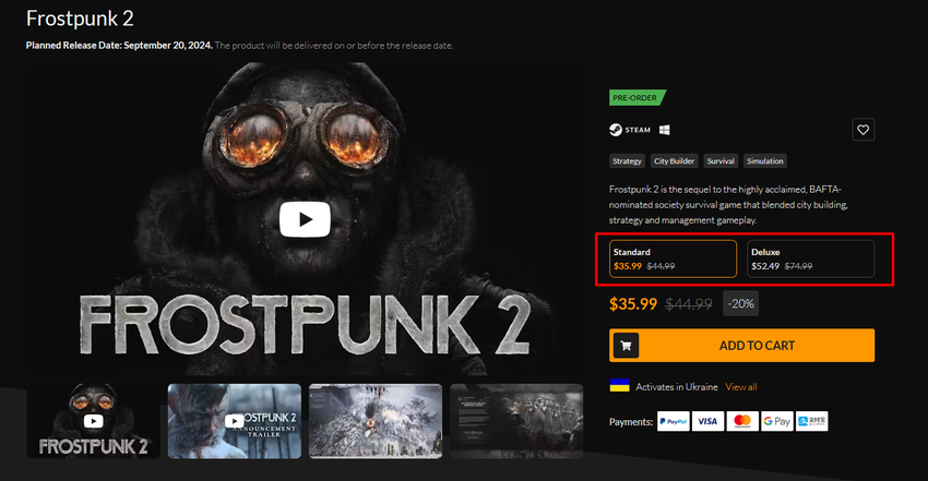 Cyfrowy sklep z kluczami do gier Steam Fanatical ma ofertę przedsprzedaży dla Frostpunk 2. Zwykła edycja pozwoli ci zaoszczędzić 20% i kupisz grę za 36 USD zamiast 45 USD. Jeśli chcesz wziąć edycję Deluxe, zniżka wyniesie 30% i zapłacisz 53 USD zamiast 75 USD.
