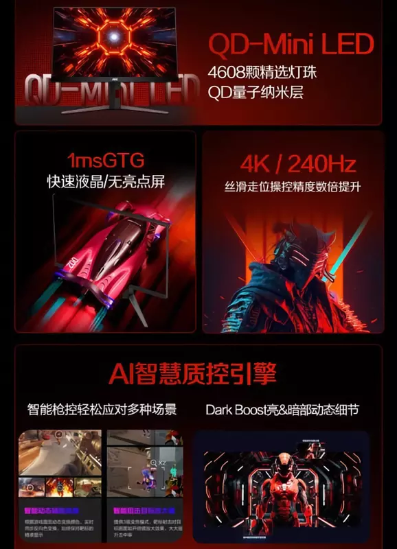 Nowość otrzymała panel QD-Mini LED o rozdzielczości 4K i częstotliwości odświeżania 240 Hz. Maksymalna jasność ekranu wynosi 1200 nitów. Monitor obsługuje 10-bitową głębię kolorów i posiada certyfikat HDR1000 dla rozszerzonego zakresu dynamiki. Ekran urządzenia pokrywa 97% przestrzeni barw DCI-P3 i 100% - sRGB. Nowość może pochwalić się także kontrastem statycznym 3000:1 i czasem reakcji GTG na poziomie 1 ms.