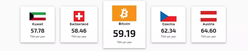 Według opublikowanego badania farmy wydobywające Bitcoin zużywają 59 TWh rocznie, a ich moc wynosi około 7 GW. Na poniższym rysunku można skorelować te koszty z poborem mocy w niektórych państwach. Ogólnie rzecz biorąc, gospodarstwa te stanowią około 0,21% całkowitego światowego zużycia energii elektrycznej, a poziom emitowanego przez nie dwutlenku węgla jest porównywalny z małym miastem (z populacją około pół miliona osób).