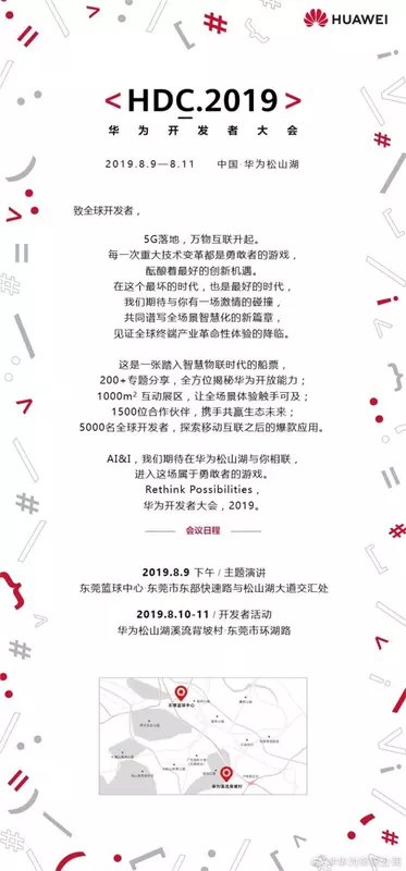 Oficjalna zapowiedź Huawei Developer Conference w 2019 roku stwierdza, że na wydarzeniu będą mówić o 5G, Internet technologii rzeczy, rzeczywistości wirtualnej i uzupełnionej, i tak dalej.