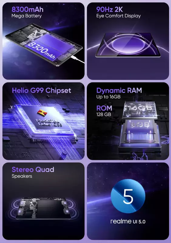 Nowość otrzyma również baterię 8300 mAh, 8 GB pamięci RAM i głośniki stereo. Gadżet powinien działać na procesorze MediaTek Helio G99 i systemie operacyjnym Android 14 z realme UI 5.0.