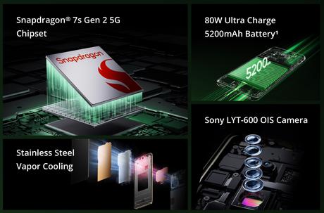 Smartfon jest napędzany ośmiordzeniowym procesorem Qualcomm Snapdragon 7s Gen 2 w połączeniu z 8/12 GB pamięci RAM (LPDDR4x) i 128/256/512 GB pamięci ROM (UFS 3.1). Nowość jest zasilana przez baterię 5200 mAh z ładowaniem 80W. Urządzenie posiada system chłodzenia i ochronę przed wodą IP65, a także Rainwater touch, który pozwala na korzystanie z ekranu mokrymi palcami.