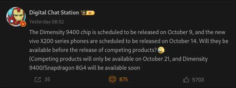 Jak się niedawno okazało, Vivo przeprowadzi prezentację smartfonów z serii X200 na nowym flagowym chipie MediaTek Dimensity 9400 już 14 października. Jednak data ogłoszenia samego chipu nie została jeszcze oficjalnie ogłoszona. Znany informator z Digital Chat Station uchylił jednak rąbka tajemnicy.