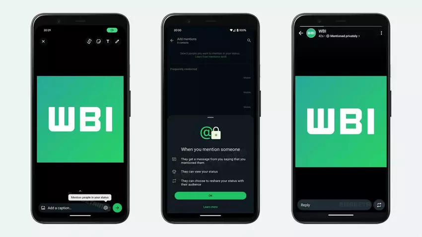 W wersji beta aplikacji 2.24.20.3 użytkownicy mogą wymieniać kontakty, dotykając przycisku "@" obok pola podpisu podczas udostępniania zdjęcia lub filmu w statusie. Wspomniany kontakt otrzyma powiadomienie i może udostępnić status swoim odbiorcom za pomocą przycisku "udostępnij", który pojawia się obok pola odpowiedzi podczas przeglądania statusu.